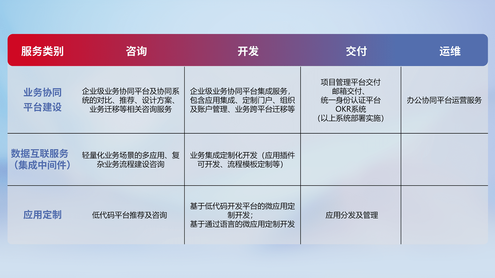 针对钉钉、、、、企微、、、IDaas等平台级产品提供产品的规划、、、、方案、、、、交付、、定制化开发等服务,,实现如统一协同办公、、智能客户服务、、、、混合会议管理、、、智能数据查询、、、、等业务场景,,实现数字化转型。。。。