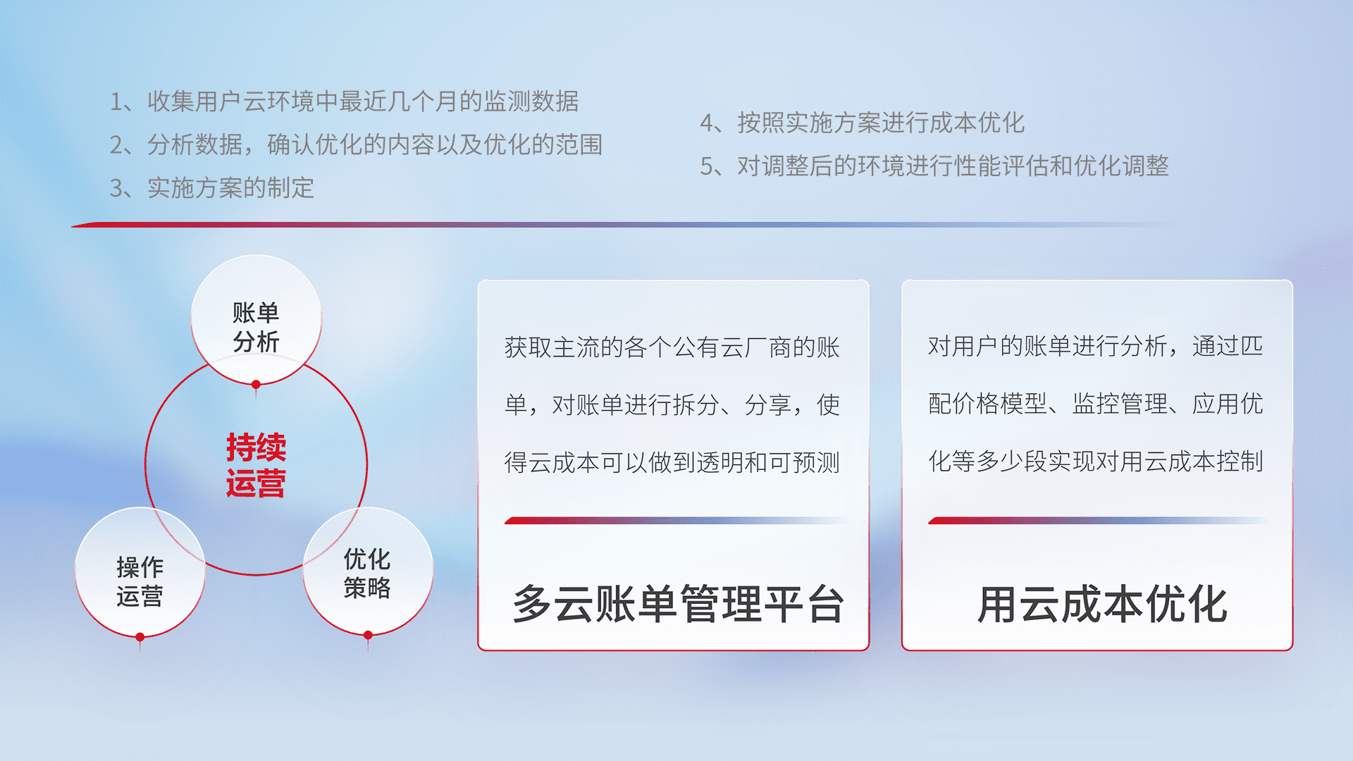 通过多云纳管,,以统一的资源数据模型把客户的云资源进行抽象和封装,,,进而实现对多云资源的统一操作,,,,保障云资源管理的可靠性、、、、稳定性与可用性。。。量身定制化运维内容,,配置、、开发运维、、、、补丁管理、、、备份、、、监控、、认证和访问管理、、审计和日常巡检等,,,保障在用云过程中的可靠度,,稳定度以及高可用率。。。。